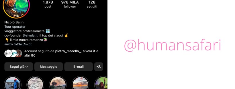 È il caso di Nicolò Balini, alias Human Safari, classe 1991, è stato il primo YouTuber di viaggi a riscuotere un’enorme popolarità in Italia. E nel suo caso, i numeri contano: ha quasi un milione di follower su Instagram e sfiora il milione anche di iscritti su YouTube, per un totale dal 1 marzo 2012, anno di inaugurazione del suo canale YouTube, di circa 110 milioni di visualizzazioni.