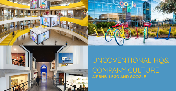 Lego’s HQ, instead, represents its company through a colorful, Lego-inspired design. The LEGO® Campus is indeed built to be a creative workplace where people can enjoy working, transpiring the real lego soul. Colorful shapes and furniture create a warm space, where Lego’s playful soul becomes visible.